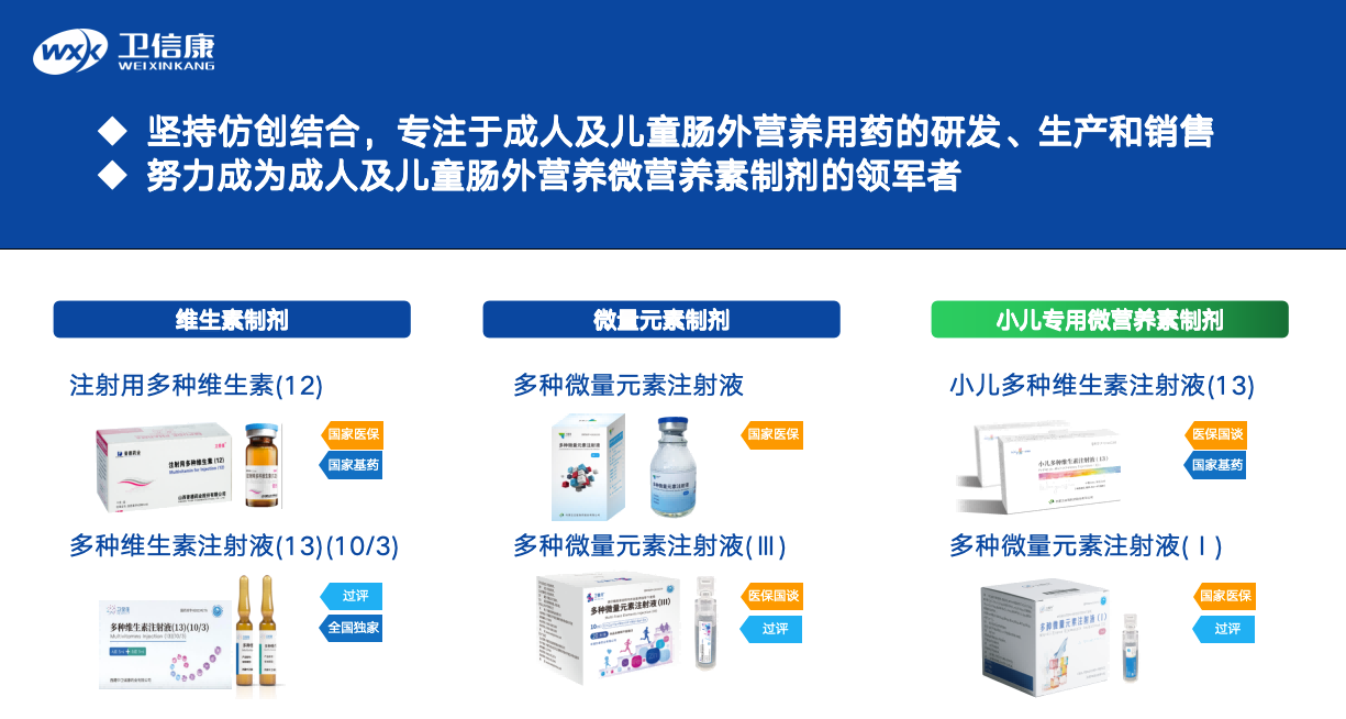 其中,多种维生素12是目前国内市场应用广泛的静脉复合维生素,也是国家基本药物,医保乙类药品。卫美佳®注射用多种维生素(12)使用专利的乳化冻干工艺,突破了12种维生素于一瓶的技术难题,实现了水脂合一的一体化稳定的维生素制剂。卫衡素®多种微量元素(40ml),进行了配方优化,适合实际诊疗需求。新近上市的卫微丹®多种微量元素(III)成人儿童均适用,符合最新的欧洲和中国指南推荐。